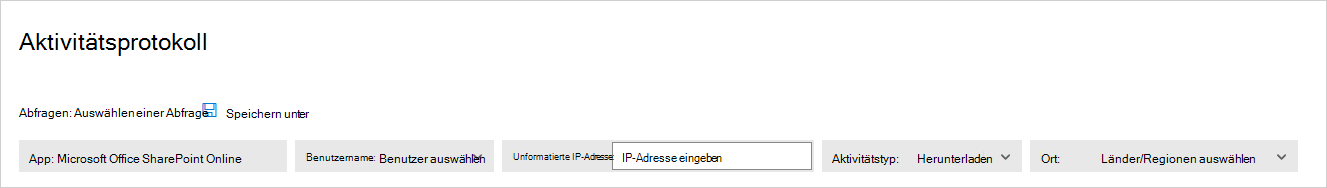 Das Aktivitätsprotokoll kann gefiltert werden, damit Sie bestimmte Aktivitäten finden können. Sie erstellen Richtlinien basierend auf den Aktivitäten und definieren dann, worüber Sie benachrichtigt werden möchten, und handeln Sie darauf. Sie können nach Aktivitäten suchen, die für bestimmte Dateien ausgeführt werden. Die Art der Aktivitäten und die Informationen, die wir für jede Aktivität erhalten, hängen von der App und der Art von Daten ab, die die App bereitstellen kann.