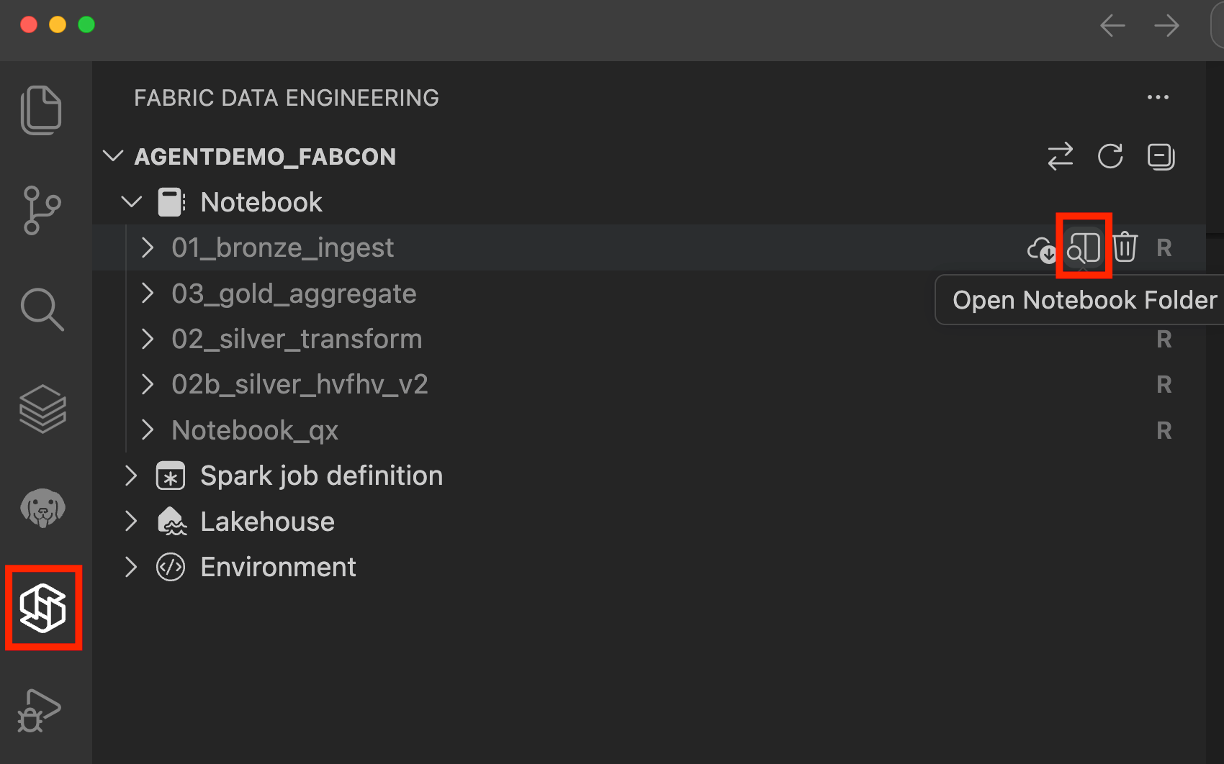 Um ein Notizbuch im VFS-Modus zu öffnen, wählen Sie die Schaltfläche "In VS Code (Desktop) öffnen" auf der Seite zum Erstellen von Notizbüchern im Fabric-Portal aus. Nachdem das Notebook in VS Code geöffnet wurde, verbindet sich die Arbeitsumgebung automatisch. Sie können das Notizbuch auch öffnen, indem Sie neben dem Notizbuchnamen im Erweiterungsbereich die Schaltfläche " Notizbuchordner öffnen " auswählen.