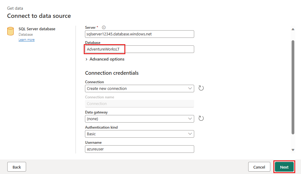 Geben Sie im Dialogfeld "Mit Datenquelle verbinden " Ihre Azure SQL-Datenbankdetails ein, und wählen Sie "Weiter" aus. Verwenden Sie die AdventureWorksLT-Beispieldatenbank aus den Voraussetzungen.