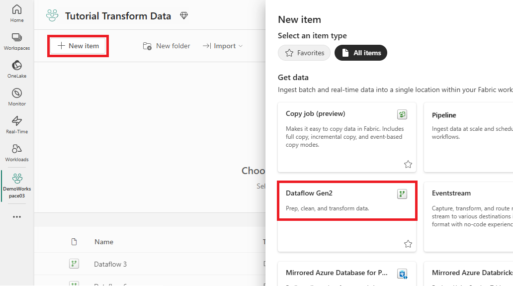 Wählen Sie ihren Fabric-aktivierten Arbeitsbereich und dann "Neu" und dann "Dataflow Gen2" aus.