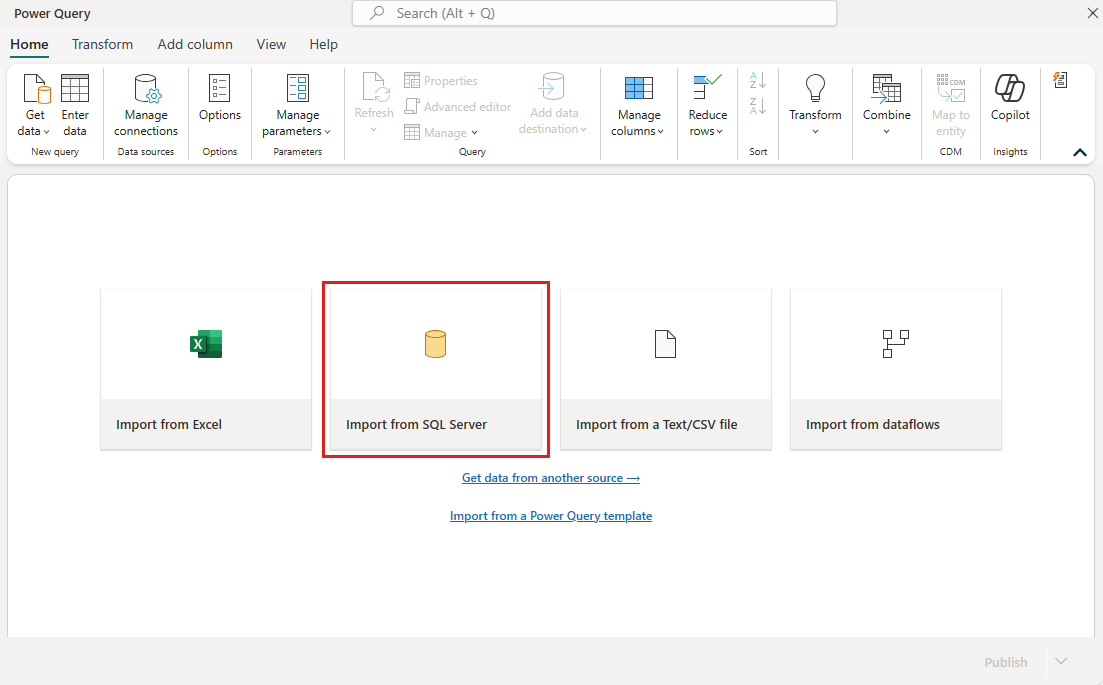 Wählen Sie im Datenfluss-Editor die Option "Aus SQL Server importieren" aus.