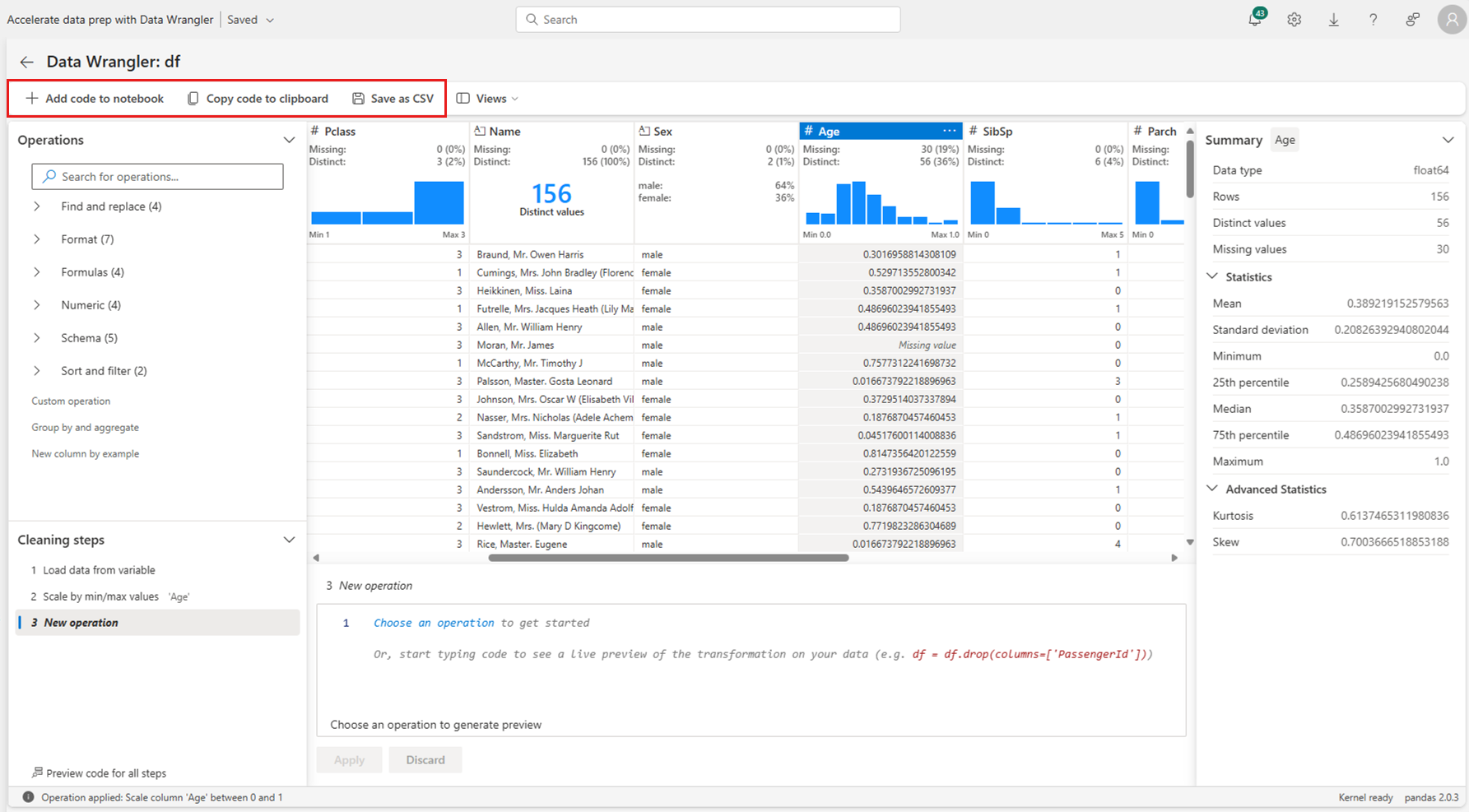 Die Symbolleiste oberhalb des Data Wrangler-Anzeigerasters bietet Optionen zum Speichern des generierten Codes. Sie können den Code in die Zwischenablage kopieren oder in das Notizbuch als Funktion exportieren. Beim Exportieren des Codes wird Data Wrangler geschlossen und die neue Funktion einer Codezelle im Notebook hinzugefügt. Sie können den bereinigten DataFrame auch als CSV-Datei herunterladen.