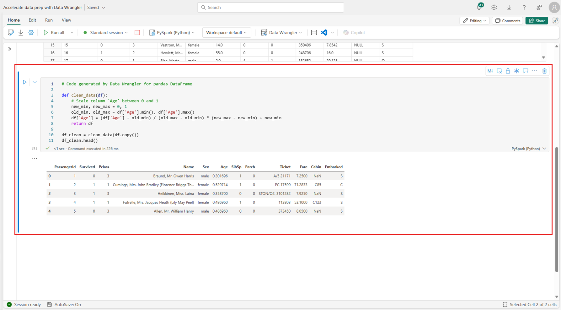 Data Wrangler generiert Code, der nur ausgeführt wird, wenn Sie die neue Zelle manuell ausführen, und ihr ursprünglicher DataFrame wird nicht überschrieben, wie in diesem Screenshot gezeigt: