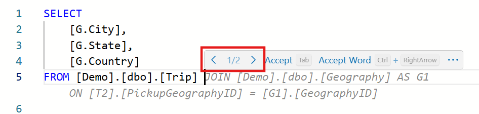 Sobald Sie im Editor mit dem Schreiben von T-SQL-Code oder Kommentaren beginnen, verwendet Copilot für Data Warehouse Ihr Warehouse-Schema und den Kontext der Abfrage-Registerkarte, um den vorhandenen IntelliSense mit Inline-Code-Vorschlägen zu ergänzen. Die Fertigstellungen können in unterschiedlichen Längen kommen – manchmal der Abschluss der aktuellen Zeile und manchmal ein ganz neuer Codeblock. Die Codevervollständigungen unterstützen alle Arten von T-SQL-Abfragen: Datendefinitionssprache (Data Definition Language, DDL), Datenabfragesprache (Data Query Language, DQL) und Datenbearbeitungssprache (Data Manipulation Language, DML). Sie können alle oder einen Teil der Vorschläge annehmen oder weiter tippen, um die Vorschläge zu ignorieren. Es kann auch alternative Vorschläge generieren, die Sie auswählen können.