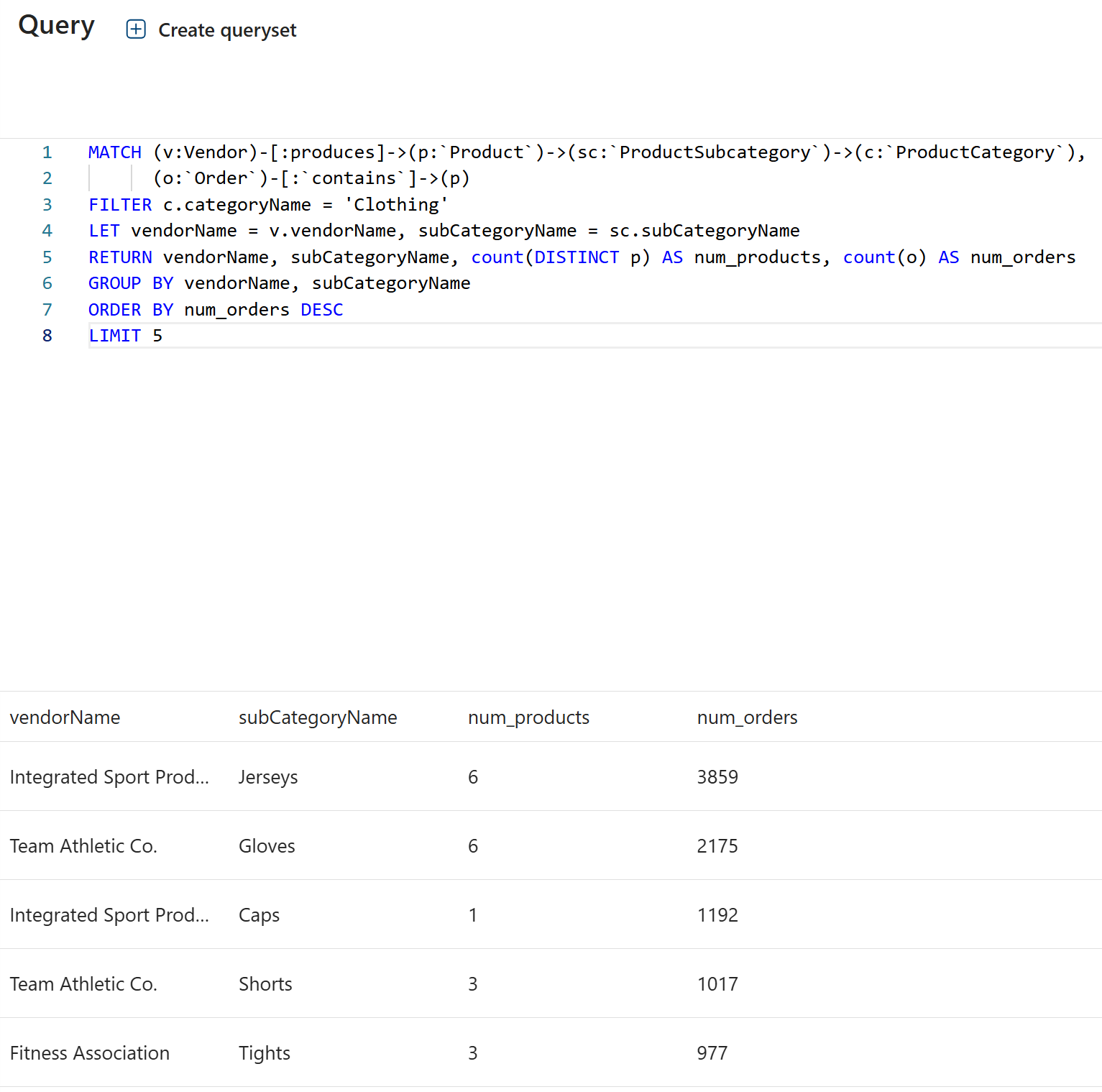 RETURN vendorName, subCategoryName, count(DISTINCT p) AS num_products, count(o) AS num_orders