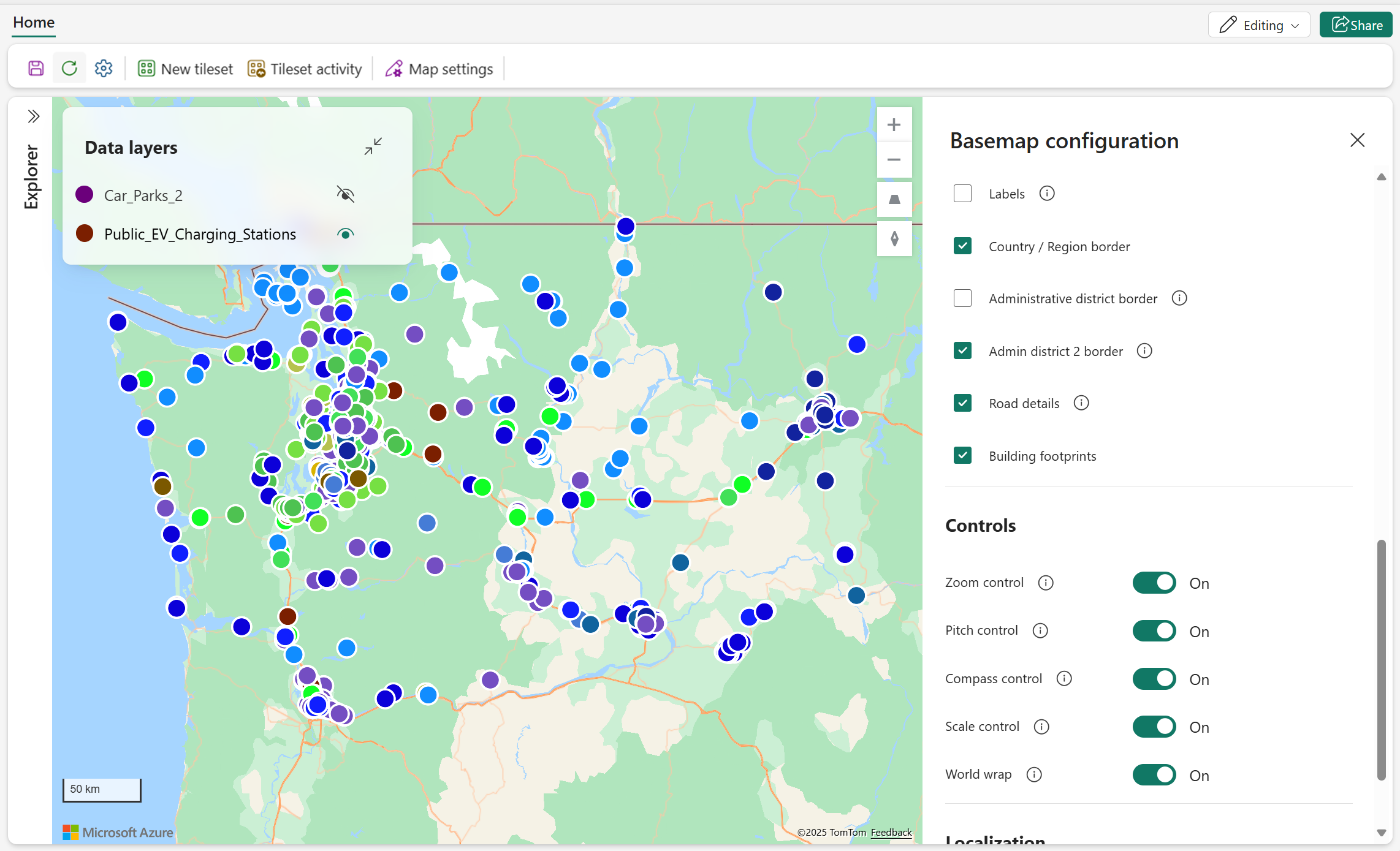 Microsoft Fabric Maps bietet eine umfassende Reihe von Optionen zum Anpassen der Karte und Anzeige. Standardmäßig ist das Kartenformat auf Graustufenlicht festgelegt, Sie können jedoch ganz einfach den Kartenstil ändern und die Sichtbarkeit verschiedener Kartenelemente umschalten. Weitere Anpassungsoptionen umfassen das Hinzufügen interaktiver Steuerelemente, das Festlegen der anfänglichen Kartenansicht und das Auswählen einer Anzeigesprache, die den Anforderungen der Benutzergruppe der Karte am besten entspricht.