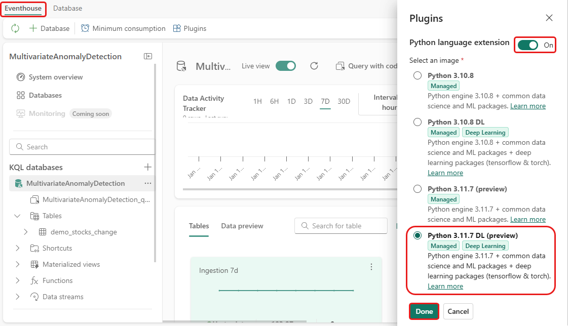 In diesem Schritt aktivieren Sie das Python-Plug-In in Ihrem Eventhouse. Dieser Schritt ist erforderlich, um den Python-Code zur Vorhersage von Anomalien im KQL-Abfragesatz auszuführen. Es ist wichtig, das richtige Paket auszuwählen, das das Paket time-series-anomaly-detector enthält.