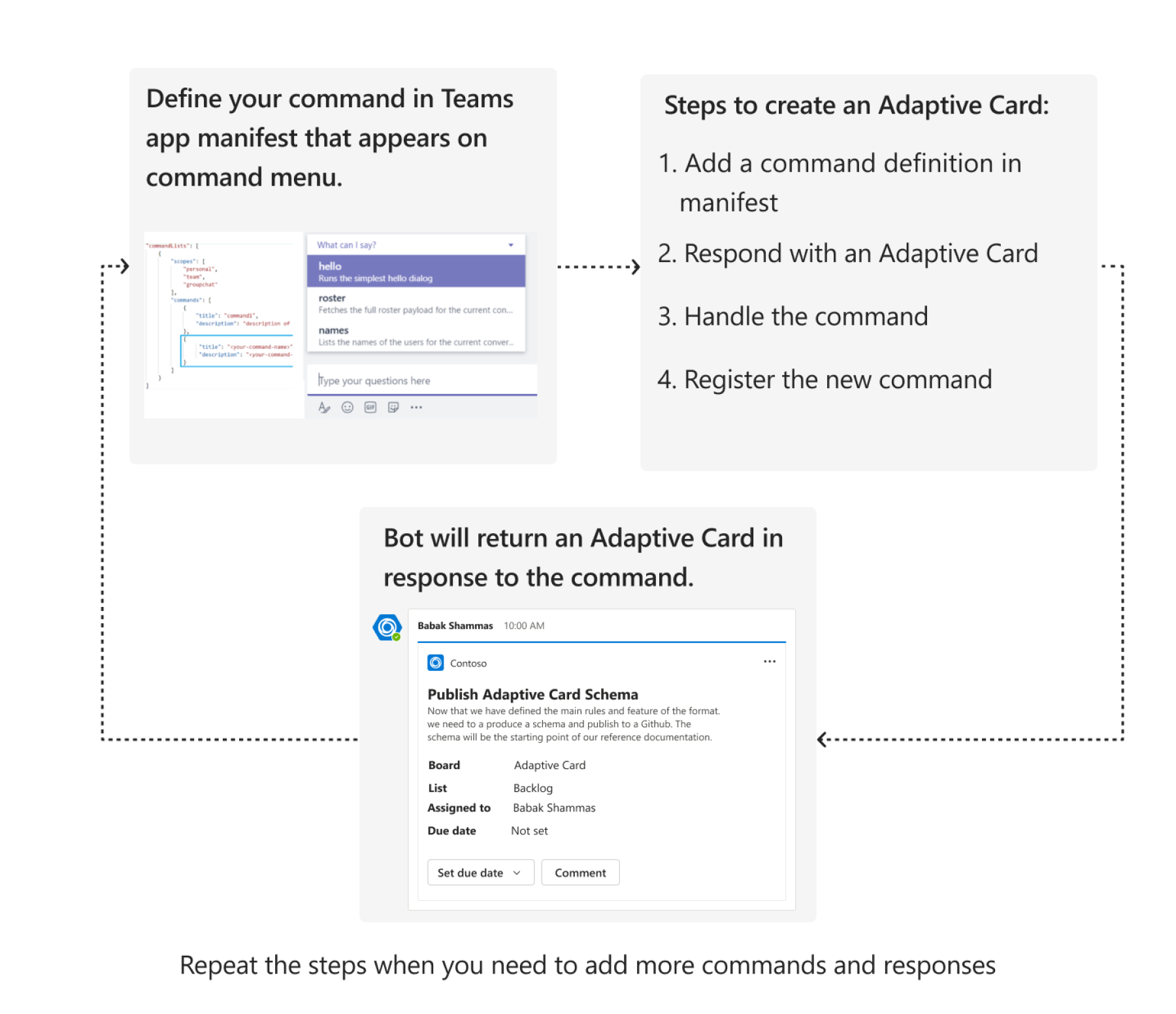 Sie können die folgenden Schritte ausführen, um Den Befehl und die Antwort mithilfe der adaptiven Karte mit dynamischem Inhalt zu erstellen: