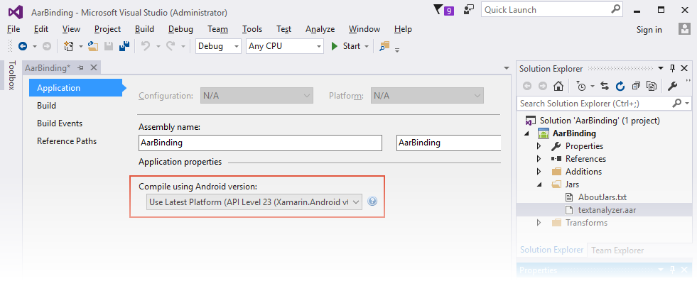 AndroidLibraryfest. Klicken Sie in Visual Studio für Mac mit der rechten Maustaste auf textanalyzer.aar, um den Buildvorgang festzulegen. In Visual Studio kann der Buildvorgang im Bereich Eigenschaften festgelegt werden:Öffnen Sie die Projekteigenschaften, um das Zielframework zu konfigurieren. Wenn die AAR-Datei Android-APIs verwendet, sollten Sie das Zielframework auf die API-Ebene festlegen, die von der AAR-Datei erwartet wird. (Weitere Informationen zur Einstellung für das Zielframework und den Android-API-Ebenen im Allgemeinen finden Sie unter Verstehen von Android-API-Ebenen).