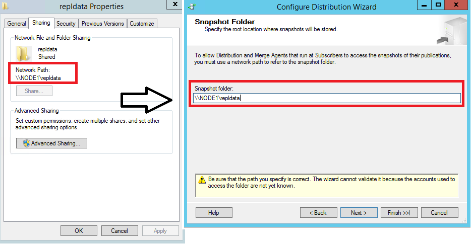Geben Sie den Pfad \\<Name_des_Herausgebercomputers>\repldata im Textfeld Momentaufnahmeordner ein, und klicken Sie anschließend auf Weiter. Dieser Pfad sollte mit dem übereinstimmen, der zuvor im Eigenschaftenordner von „repldata“ unter Netzwerkpfad nach dem Konfigurieren der Freigabeeigenschaften angezeigt wurde.