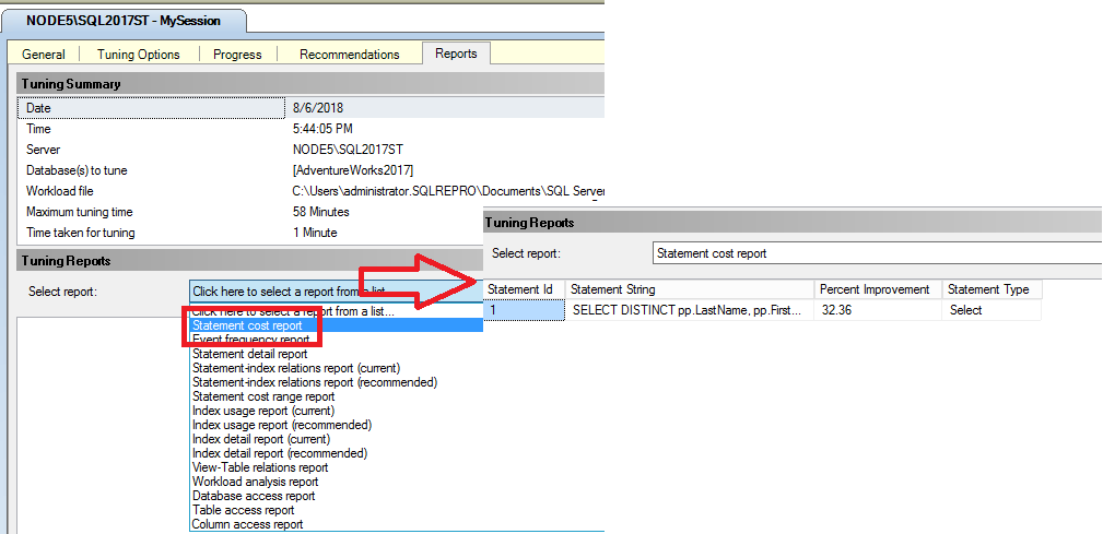 Wählen Sie im Datenbankoptimierungsratgeber die Registerkarte Berichte aus.