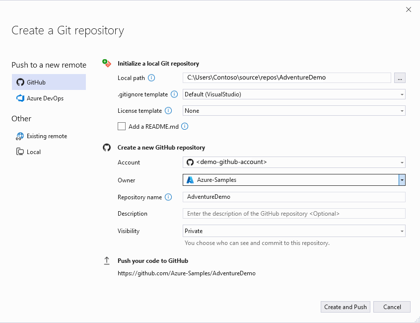 Wählen Sie im Dialogfeld Git-Repository erstellen im Abschnitt In neues Remoterepository pushen die Option GitHub aus.