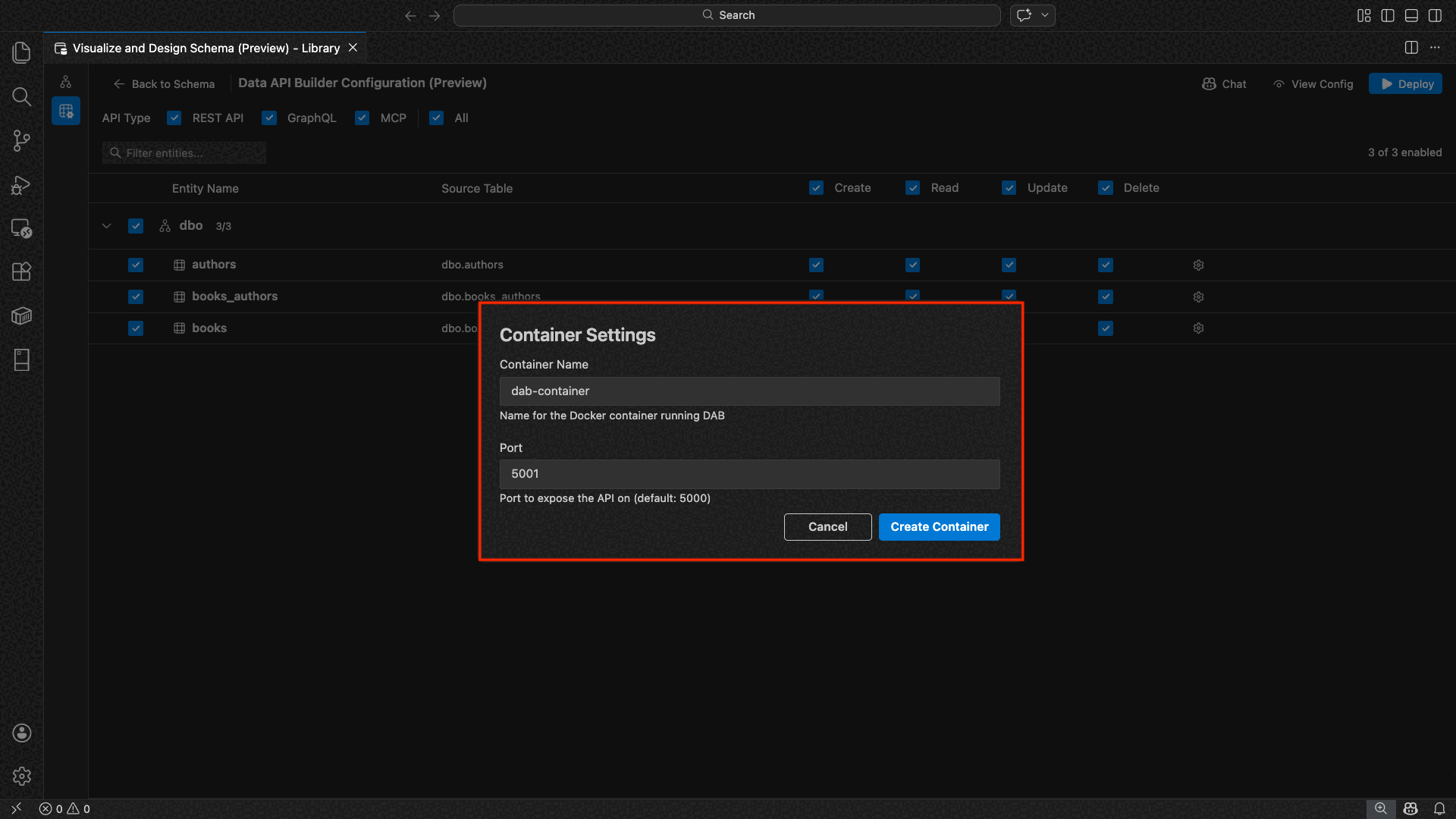 Die MSSQL-Erweiterung für Visual Studio Code enthält eine integrierte Benutzeroberfläche für den Daten-API-Generator, sodass Sie REST-, GraphQL- und MCP-Endpunkte für Ihre SQL-Datenbanktabellen erstellen können, ohne Konfigurationsdateien zu schreiben oder Visual Studio Code zu verlassen. Sie können auswählen, welche Tabellen verfügbar gemacht werden sollen, CRUD-Berechtigungen konfigurieren, API-Typen auswählen, eine Vorschau der generierten Konfiguration anzeigen und ein lokales Back-End bereitstellen, das vom Daten-API-Generator unterstützt wird, alles über eine visuelle Schnittstelle.
