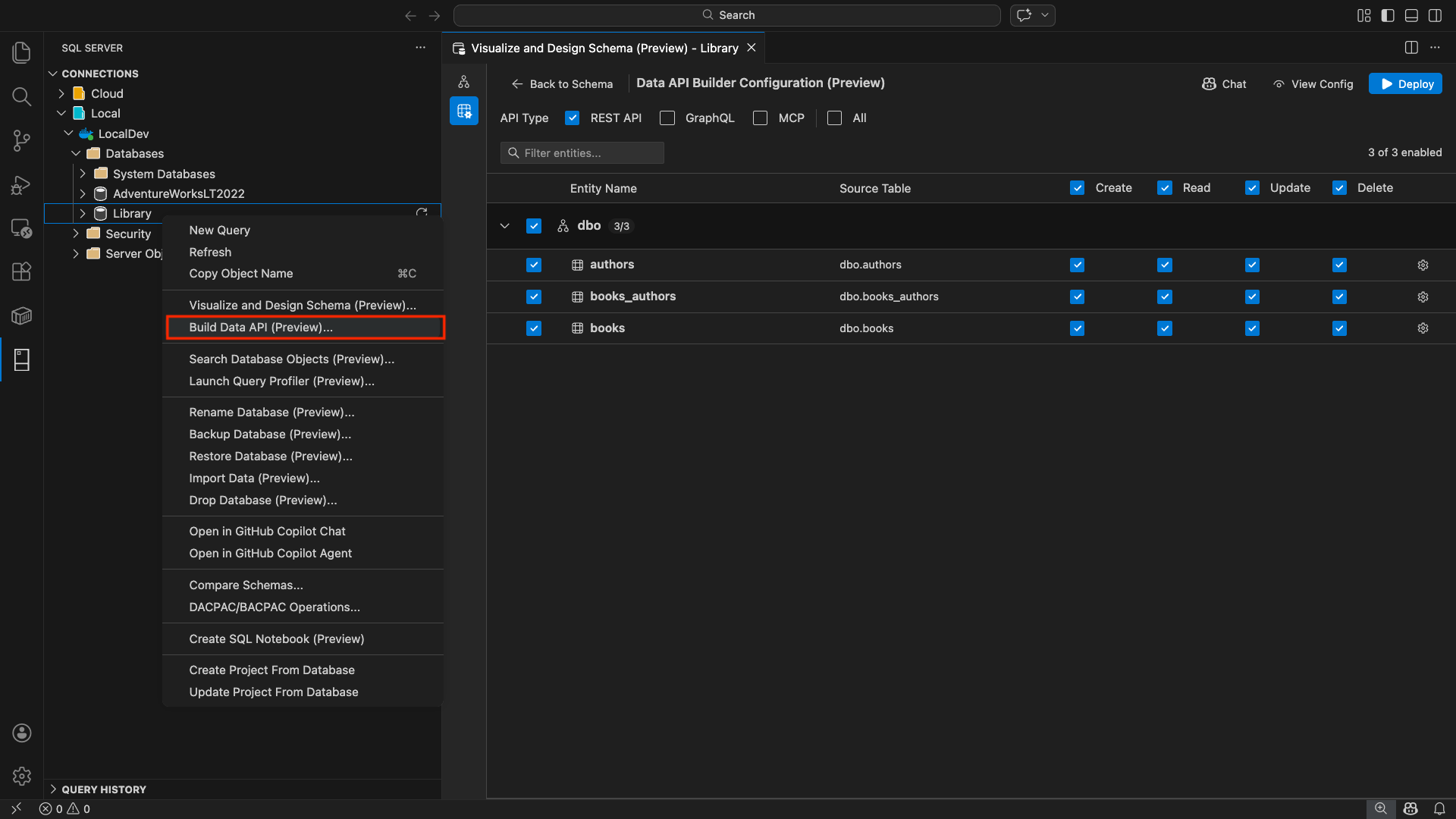 "Enable all SalesLT entities for read operations""Expose only the Customer and Product tables with full CRUD permissions""Set all entities in the dbo schema to read-only""Disable the BuildVersion and ErrorLog entities""Can you also enable MCP for the Data API builder API?"