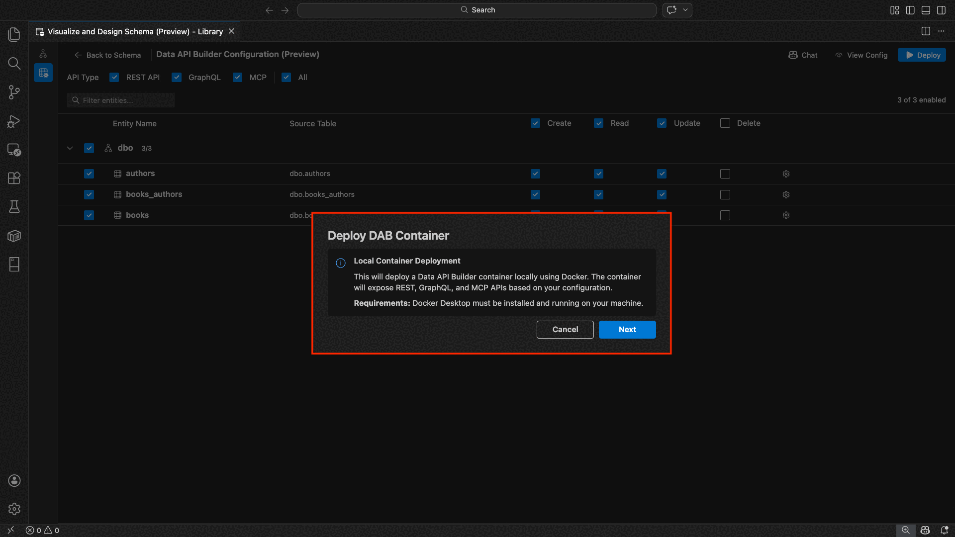 Die MSSQL-Erweiterung für Visual Studio Code enthält eine integrierte Benutzeroberfläche für den Daten-API-Generator, sodass Sie REST-, GraphQL- und MCP-Endpunkte für Ihre SQL-Datenbanktabellen erstellen können, ohne Konfigurationsdateien zu schreiben oder Visual Studio Code zu verlassen. Sie können auswählen, welche Tabellen verfügbar gemacht werden sollen, CRUD-Berechtigungen konfigurieren, API-Typen auswählen, eine Vorschau der generierten Konfiguration anzeigen und ein lokales Back-End bereitstellen, das vom Daten-API-Generator unterstützt wird, alles über eine visuelle Schnittstelle.
