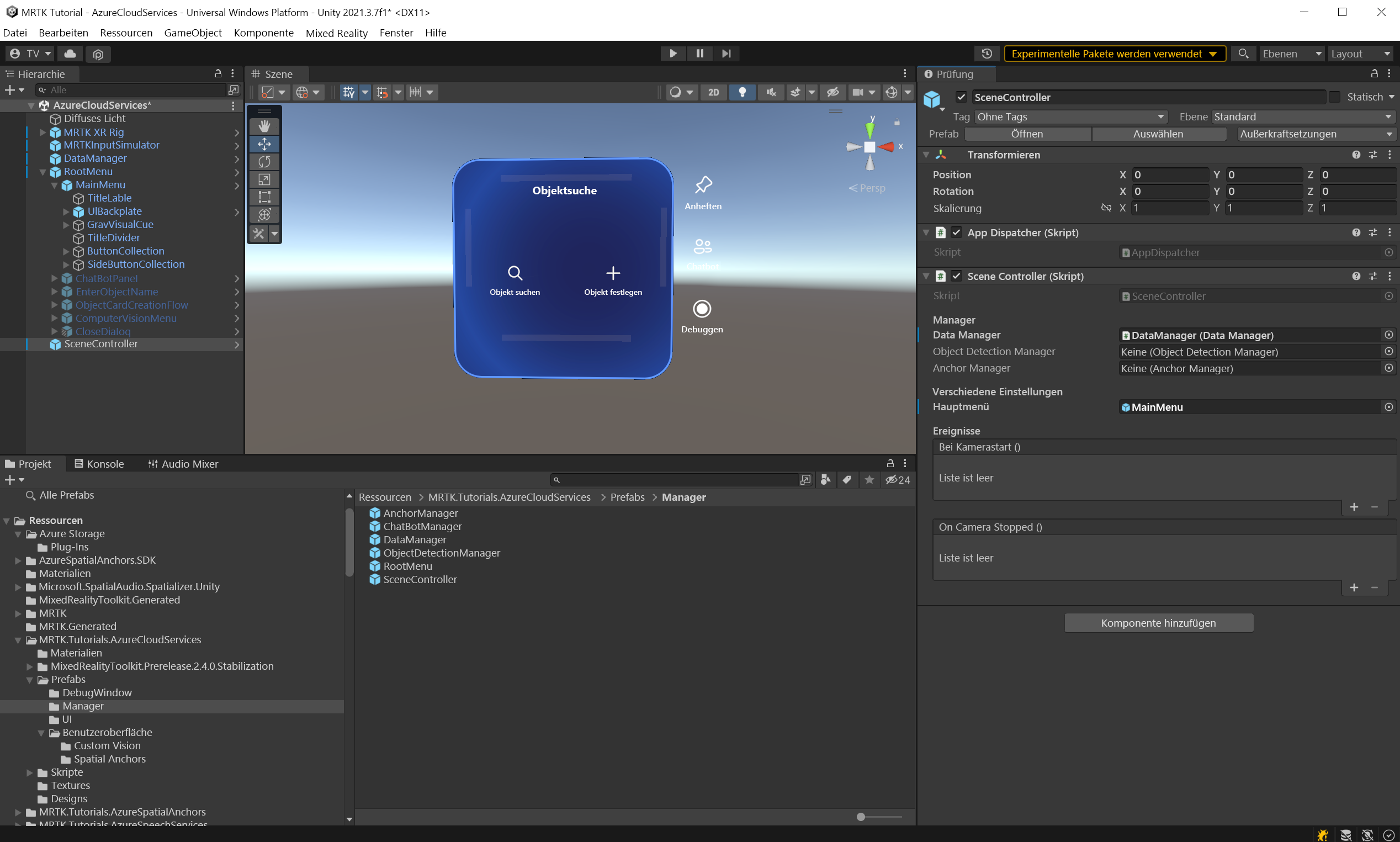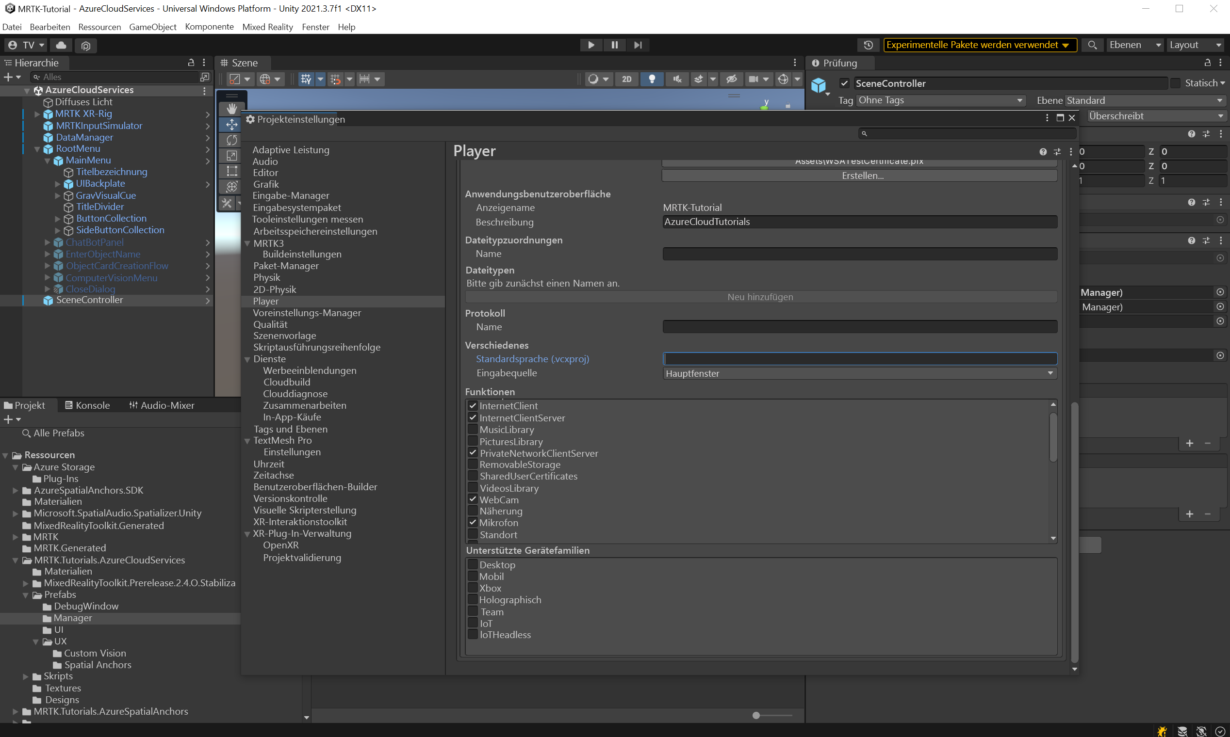 Bevor wir die Szene fertig stellen, bereiten wir das Projekt für HoloLens 2 vor.