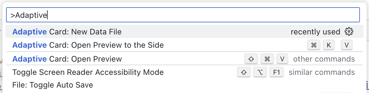 >Adaptive, um Befehle im Zusammenhang mit adaptiven Karten zu suchen.Wählen Sie in der Liste Adaptive Karte: Neue Datendatei aus. Visual Studio Code erstellt eine neue Datei mit dem Namen order.data.json.