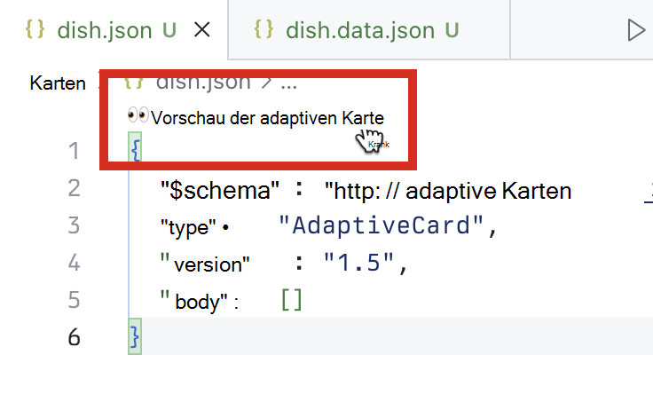 Erstellen Sie im Ordner cards eine neue Datei mit dem Namen dish.json. Fügen Sie den folgenden Inhalt ein, der eine leere adaptive Karte darstellt: