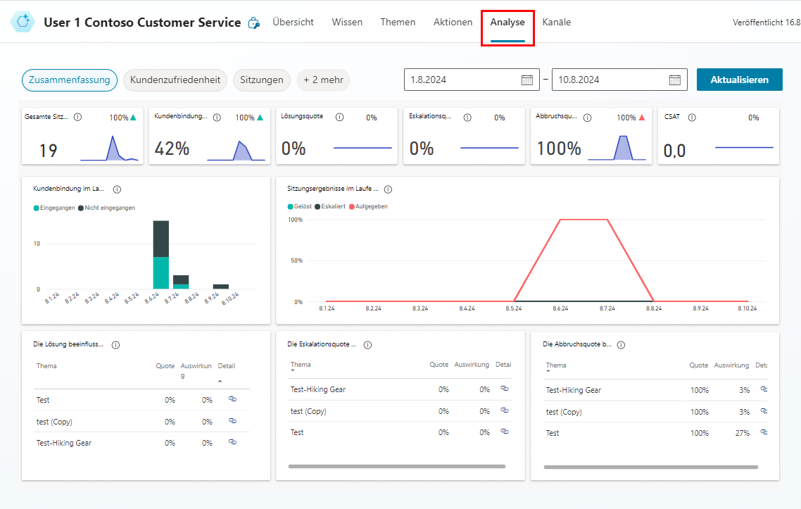 Wählen Sie Analyse über die obere Navigationsleiste Ihrer Agent-Startseite aus, um die Analyse Ihres ausgewählten Agents anzuzeigen.