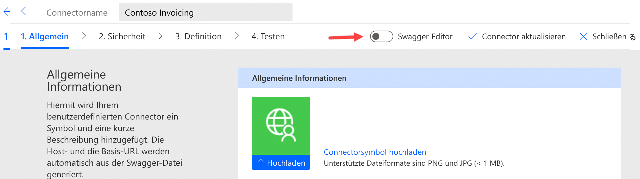 Eingebauter Swagger-Editor – Der benutzerdefinierte Konnektor-Designer verfügt über einen integrierten OpenAPI-Editor, mit dem sich OpenAPI-Erweiterungen am schnellsten hinzufügen lassen.