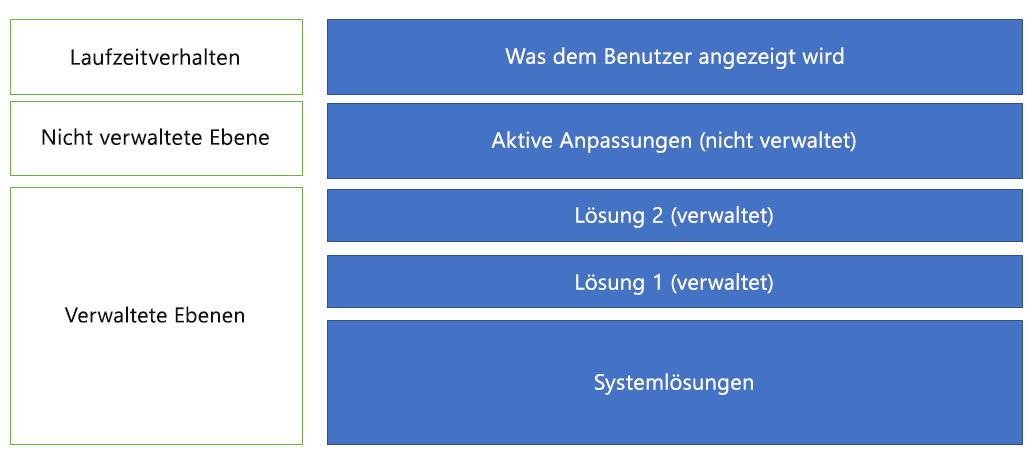 Das Ebenenkonzept ist der Schlüssel dafür, dass mehrere Lösungen in einer einzigen Umgebung zusammenarbeiten können. Es erleichtert auch das Ermöglichen weiterer Anpassungen von Komponenten aus einer verwalteten Lösung.