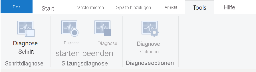 Rufen Sie auf dem Menüband „Start“ die Option Extras auf, um die Abfragediagnose im Power Query-Editor zu öffnen. Wenn Sie bereit sind, mit dem Transformieren der Daten zu beginnen oder andere Änderungen im Power Query-Editor vorzunehmen, klicken Sie im Abschnitt Sitzungsdiagnose auf Diagnose starten. Wenn Sie fertig sind, denken Sie daran, auf Diagnose beenden zu klicken.