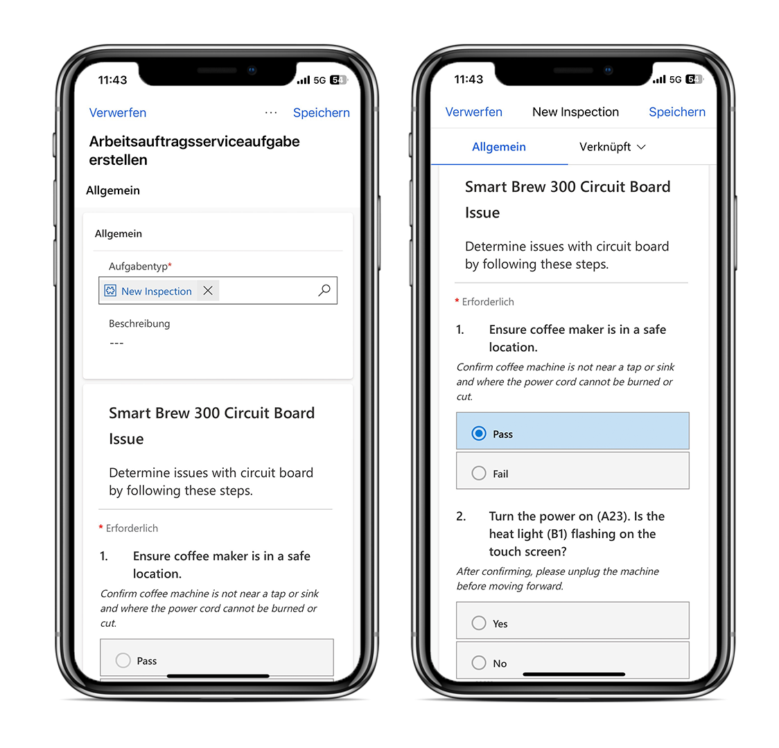 Mitarbeiter im Außendienst, die die mobile App verwenden, können Inspektionen durchführen, ohne die Anwendung verlassen zu müssen. Mitarbeiter im Außendienst können Inspektionen über die mobile Anwendung starten und abschließen. Nachdem der Mitarbeiter im Außendienst die Inspektion abgeschlossen hat, werden die Daten in der Field Service-Anwendung gespeichert, was es dem Mitarbeiter erleichtert, Ergebnisse zu melden und Inspektionen in die automatisierten Geschäftsprozesse einzupassen.