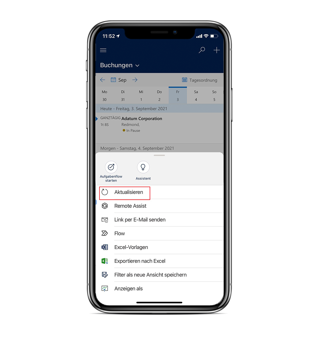 Sie können bestimmte Ansichten synchronisieren, indem Sie im unteren Menü der App auf Aktualisieren klicken. Durch Auswahl der Option Aktualisieren können Sie beispielsweise Buchungen aktualisieren, wie im folgenden Screenshot gezeigt.