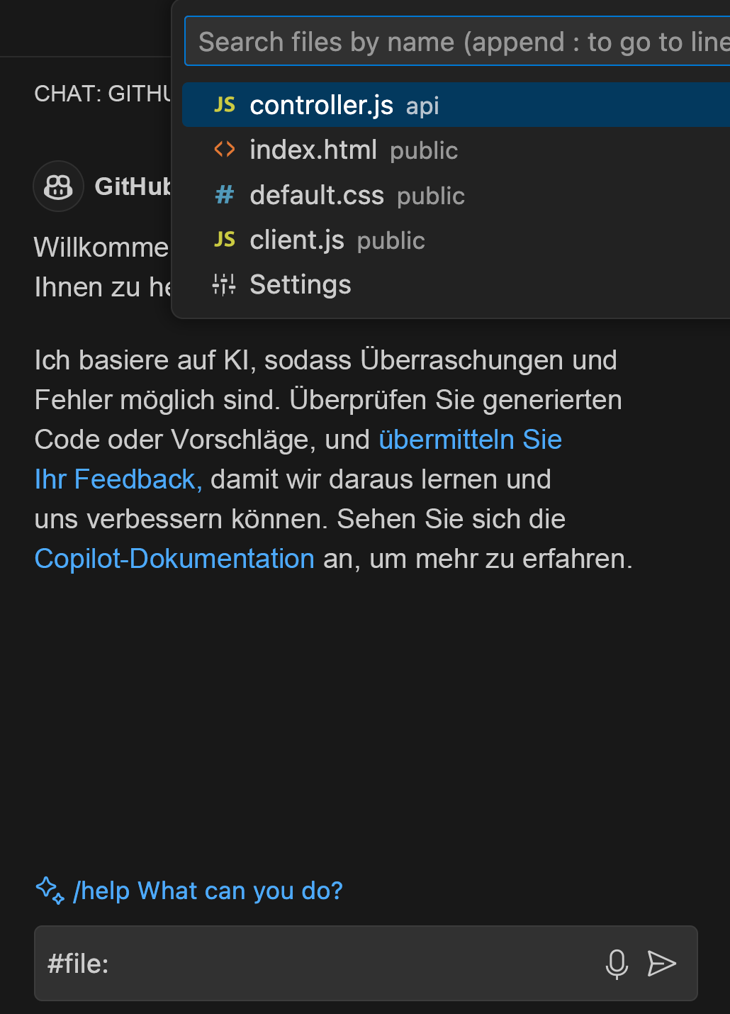 controller.jsarbeiten, können Sie den Befehl #file verwenden, um sie auszuwählen und direkt in Ihrer Frage mit#file:controller.jsdarauf zu verweisen. Dieses Feature weist Copilot Chat an, sich beim Generieren einer Antwort auf den Inhalt dieser Datei zu konzentrieren.Umgebungsverweise: Mit