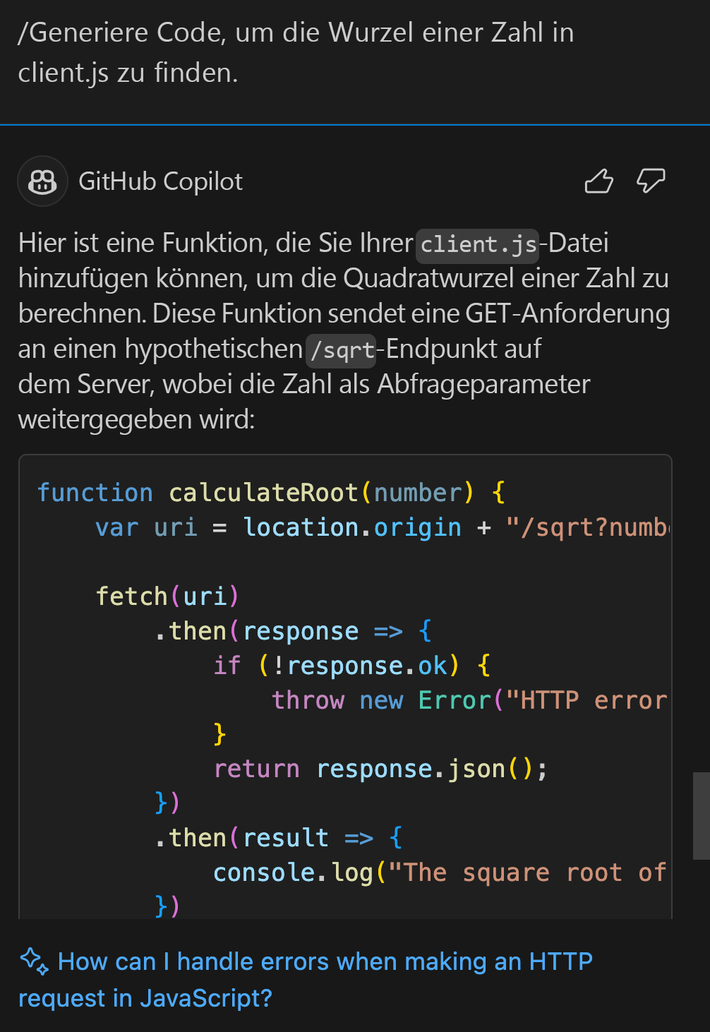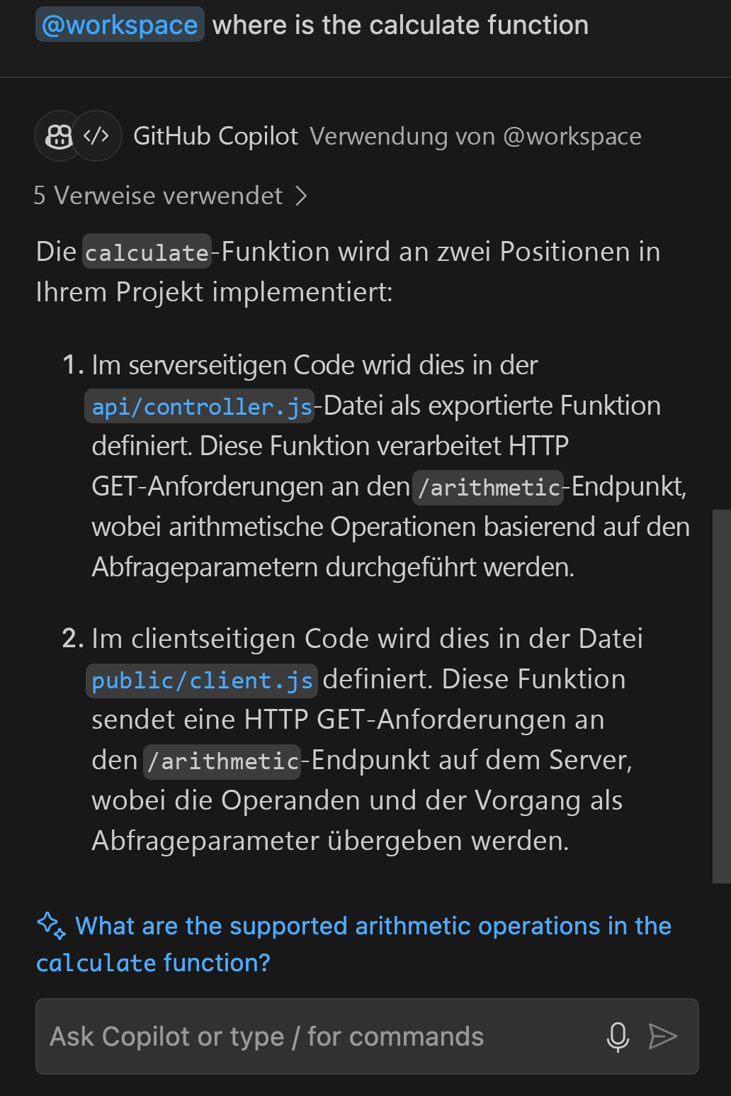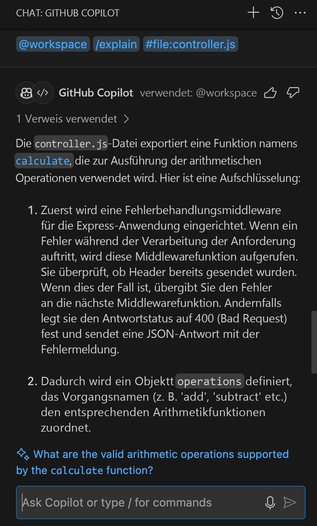 /docgefolgt von dem Code eingeben, den Sie dokumentieren möchten, und Copilot generiert entsprechende Kommentare./explain: Bietet Erläuterungen für ausgewählten Code. Dieser Befehl ist nützlich, wenn Sie verstehen müssen, was ein bestimmter Codeabschnitt tut. Beispielsweise liefert