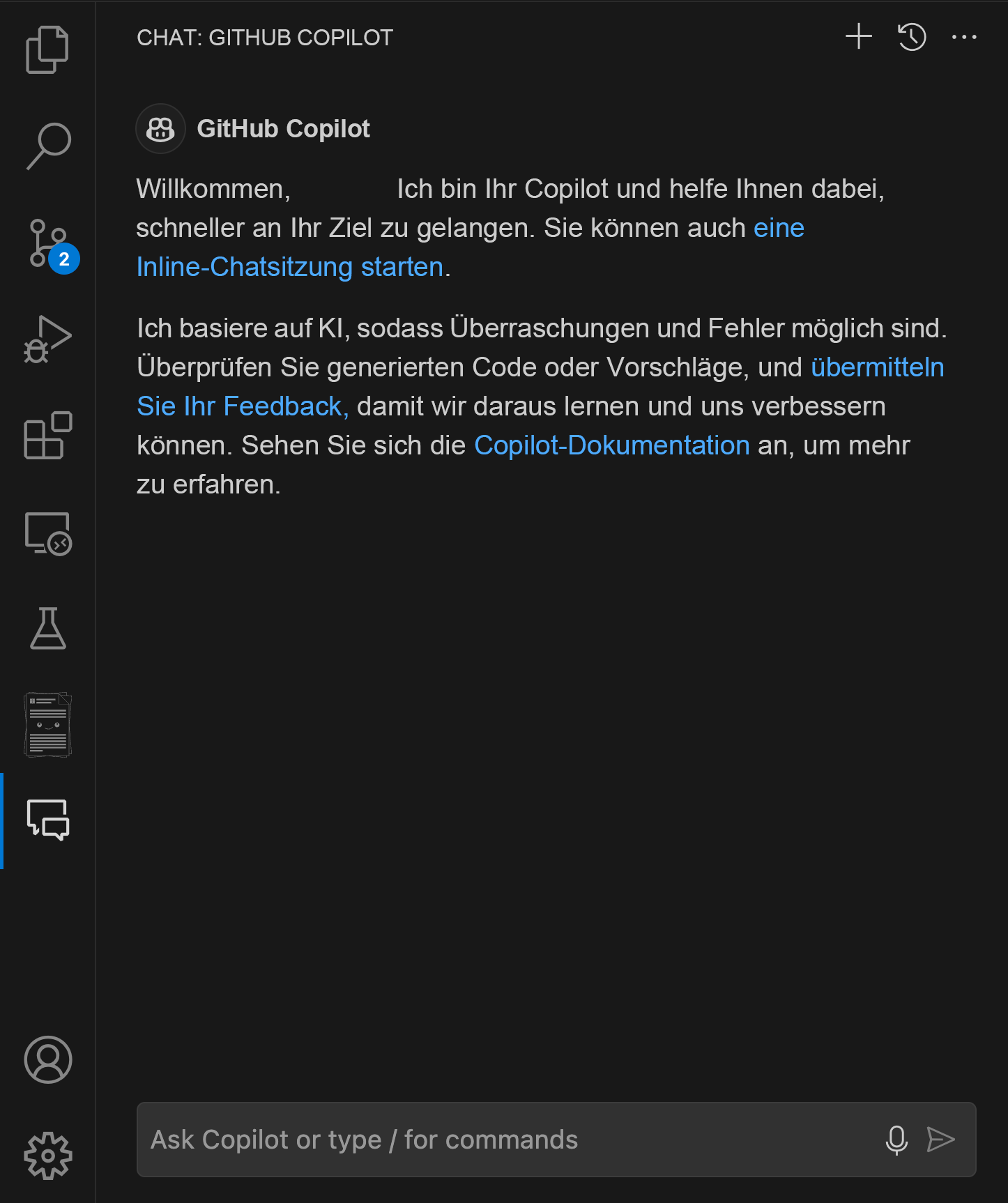 Um auf Copilot in Ihrer integrierten Entwicklungsumgebung (Integrated Development Environment, IDE) zuzugreifen, klicken Sie auf das Chatsymbol auf der linken Navigationsleiste.