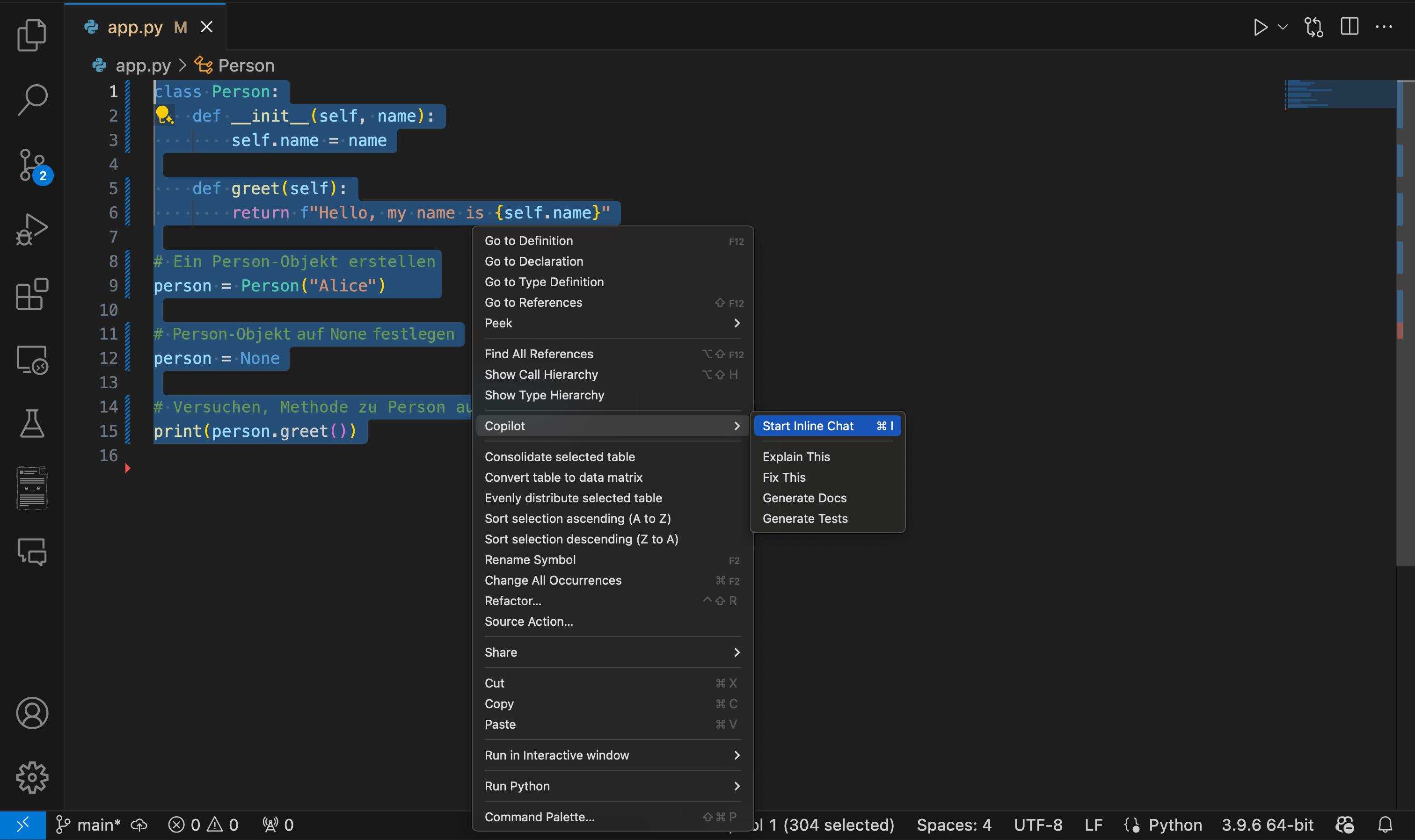 Debugging-Unterstützung: Wenn Fehler in Ihrem Code auftreten, kann Copilot Chat Sie bei der Analyse von Fehlermeldungen unterstützen und potenzielle Korrekturen vorschlagen. Copilot Chat kann helfen, logische Fehler zu identifizieren und schrittweise Erläuterungen problematischer Codeabschnitte bereitzustellen. Eine Möglichkeit, dieses Ergebnis zu erzielen, besteht darin, dass Copilot inline-Chat verwendet wird, indem der Codeabschnitt hervorgehoben wird, der den Fehler enthält, klicken Sie mit der rechten Maustaste, und wählen Sie "Copilot" und dann "Inline-Chat" aus.