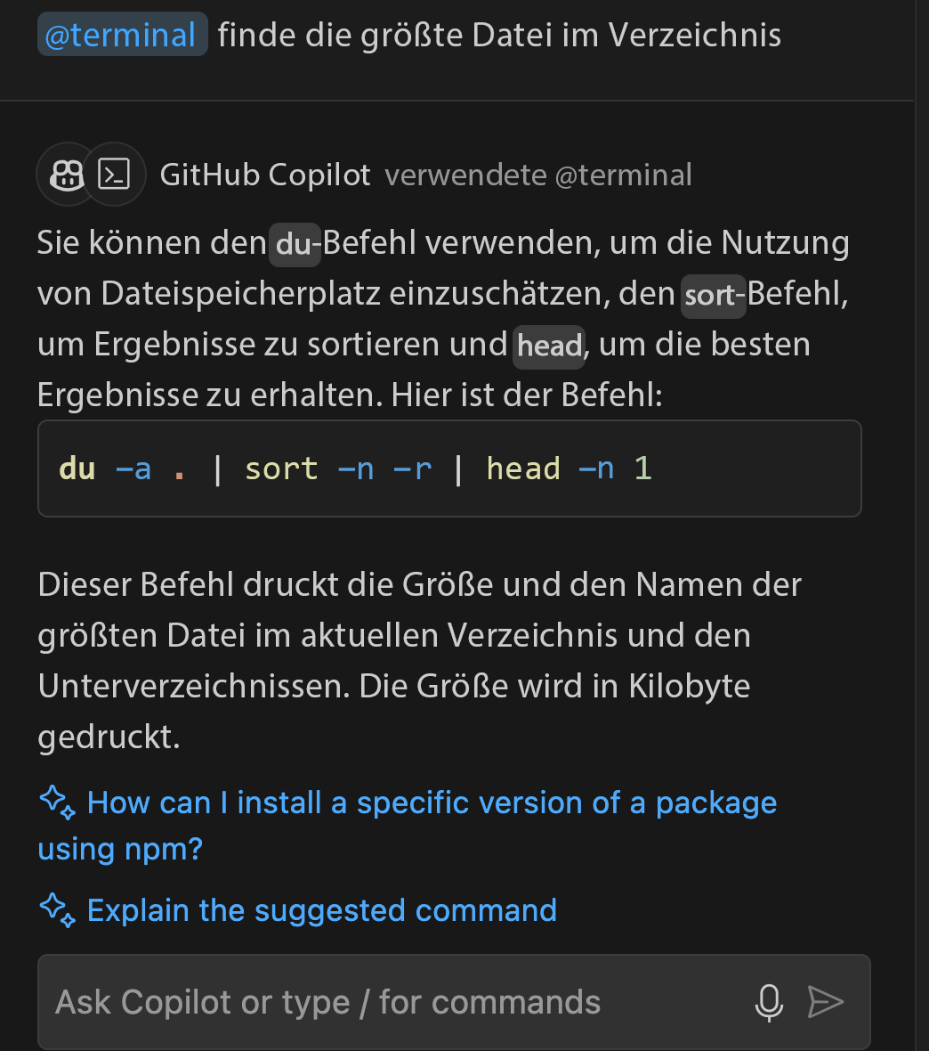 @terminal: Dieser Agent ist nützlich für Fragen im Zusammenhang mit er Befehlszeile. Sie könnten ihn beispielsweise auffordern, die größte Datei in einem Verzeichnis zu finden oder den zuletzt ausgeführten Befehl zu erläutern.