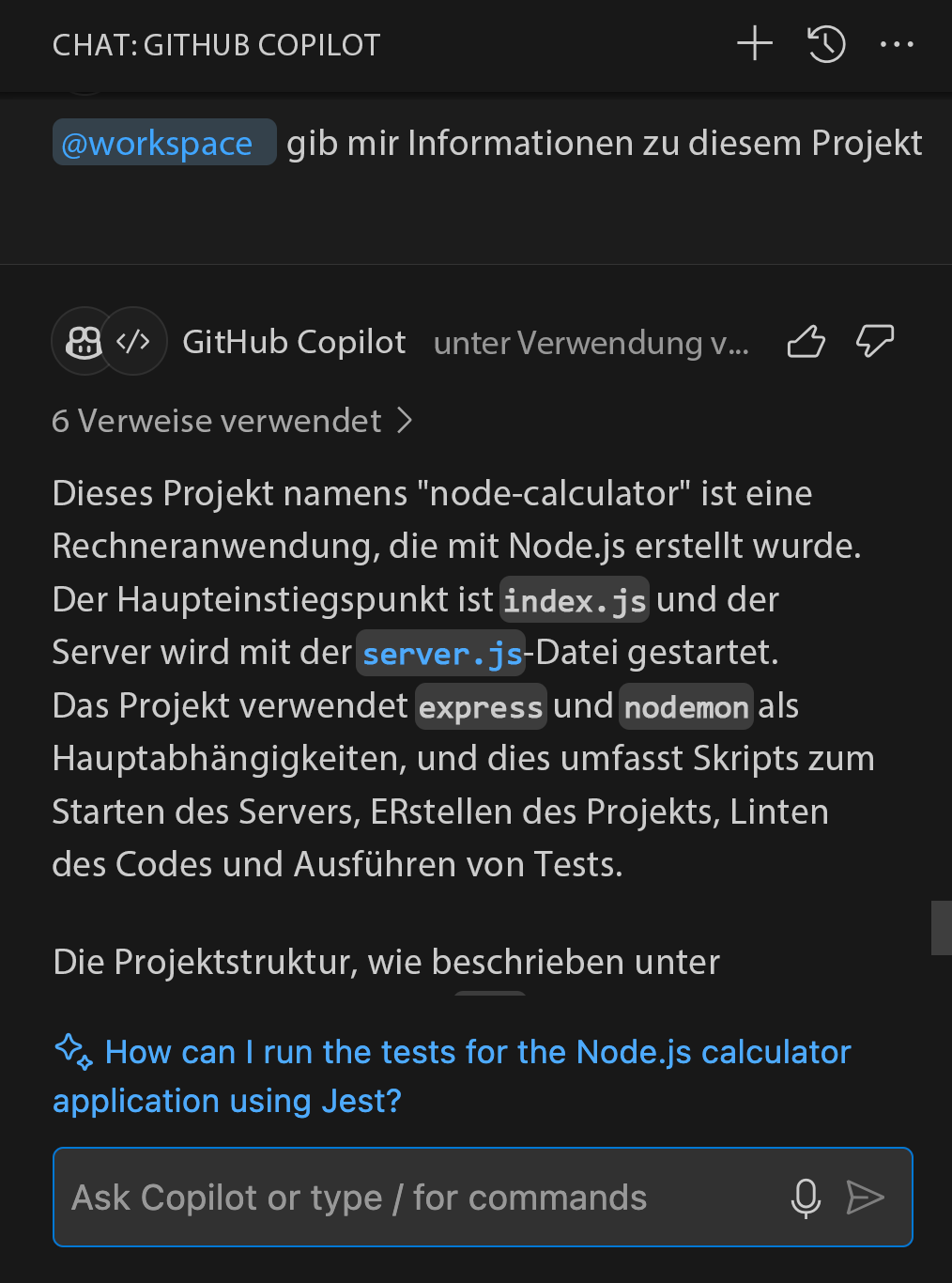 @workspace: Dieser Agent ermöglicht es Ihnen, den Kontext aller Fragen, die Sie Copilot stellen, auf das gesamte Projekt zu erweitern. Es ist nützlich, Code zu generieren, der sofort in Ihr Projekt passt, indem Informationen aus Ihrem gesamten Projekt verwendet werden. Er kann auch verwendet werden, um Antworten zu Ihrer gesamten Codebasis zu erhalten.