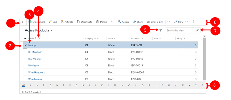 Ansichten werden verwendet, um mehrere Datensätze aus einer einzelnen Tabelle gleichzeitig anzuzeigen. Wenn Sie eine Tabelle zum ersten Mal öffnen, wird normalerweise die Listenansicht angezeigt, in der eine Liste der Zeilen angezeigt wird, die zu dieser Tabelle gehören, formatiert als Tabelle. Wenn Sie z. B. die Tabelle Products öffnen, wird Ihnen eine Liste mit allen Produkten angezeigt, die eine Organisation möglicherweise verkauft. Ansichten verfügen über verschiedene Tools, die beim Suchen und Verwalten von Datensätzen helfen.