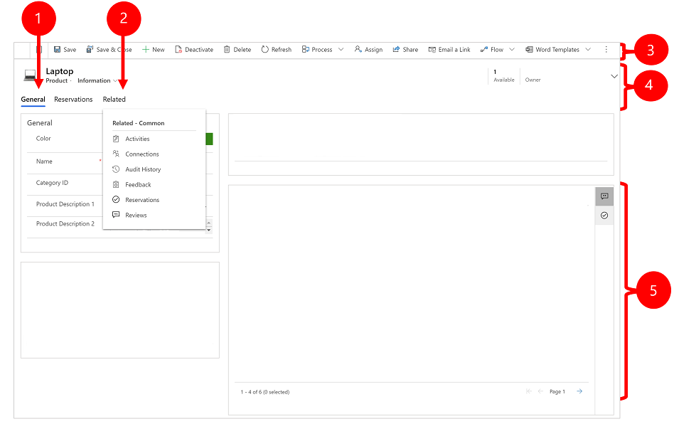 Zugehörig: Die Registerkarte „Zugehörig“ bietet Zugriff auf alle Arten von Datensätzen, die mit dem aktuellen Datensatz verknüpft sind. Beispielsweise können einem Account mehrere Kontakte, Angebote, Bestellungen und Rechnungen zugeordnet sein. Die Registerkarte „Zugehörig“ bietet Zugriff auf die zugehörigen Datensätze. Diese Registerkarte ist eine Dropdownliste, die Sie verwenden können, um andere Arten von Zeilen zu finden, die die angezeigte Zeile verwenden oder darauf verweisen. Wenn Sie einen Tabellennamen aus der Dropdownliste „Zugehörig“ auswählen, wird eine neue Registerkarte mit dem Namen dieser Tabelle geöffnet, in der alle zugehörigen Zeilen dieses Typs aufgelistet sind. Die Registerkarte „Zugehörig“ bleibt verfügbar, und Sie können sie weiterhin verwenden, um andere Arten von Zeilen zu finden, die auf die Tabelle verweisen.
