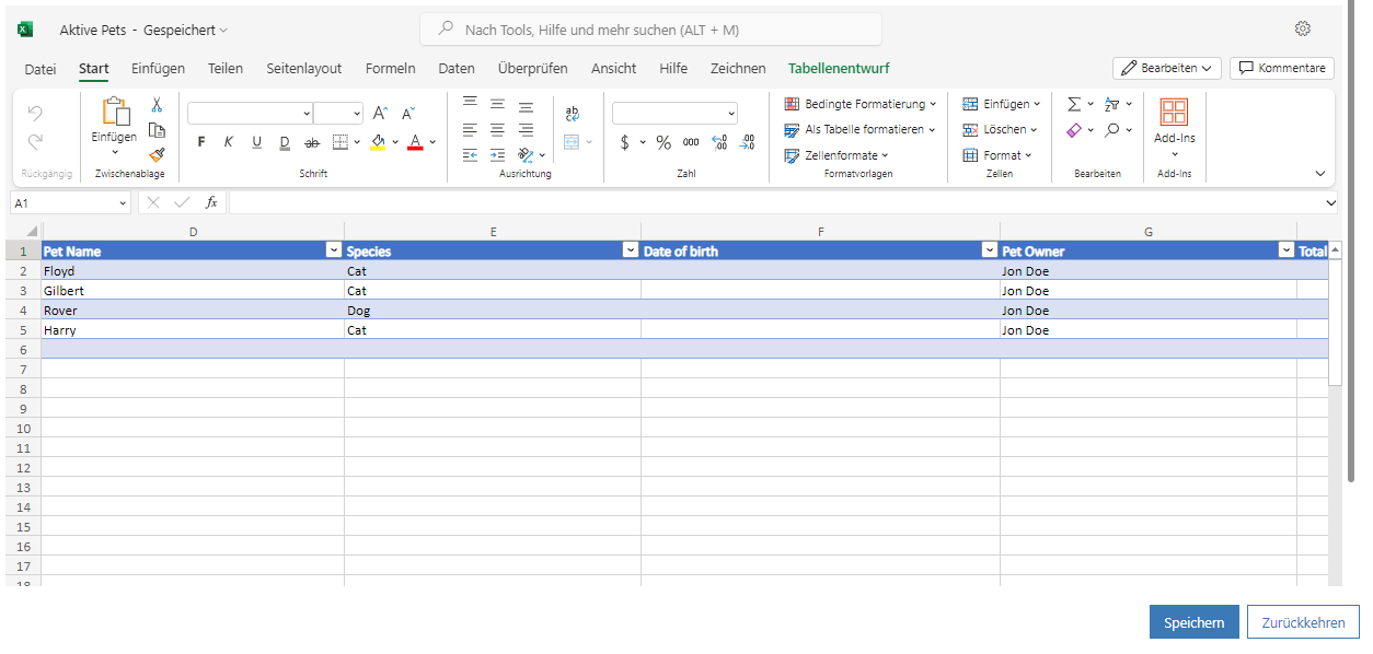Die Funktion „In Excel Online öffnen“ in modellgesteuerten Apps zeigt die Zeilen und Spalten der aktuellen Tabellenansicht an und ermöglicht Ihnen schnelle Änderungen, das Erstellen neuer Zeilen und das anschließende Speichern der aktualisierten Informationen in Dataverse.