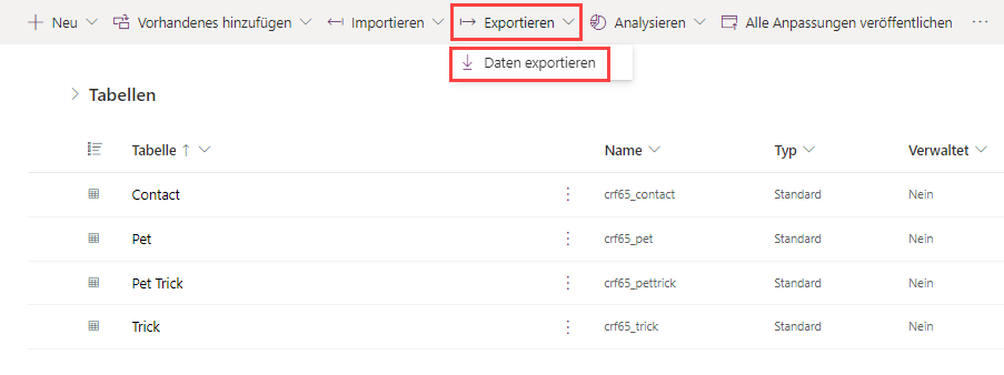 Bei der Option „Daten exportieren“ im Power Apps Maker Portal handelt es sich um einen einfachen Export, der alle Spalten und alle Zeilen für eine oder mehrere Tabellen extrahiert.