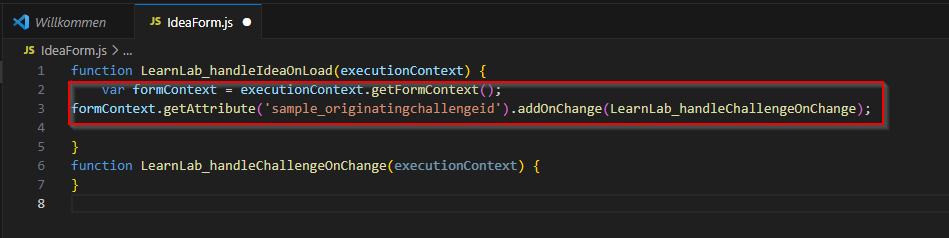 function LearnLab_handleIdeaOnLoad(executionContext) { } function LearnLab_handleChallengeOnChange(executionContext) { }Fügen Sie der Funktion OnLoad das Skript hinzu. Dieses Skript registriert einen Ereignishandler OnChange, Sie müssen OnChange verarbeiten, falls sich die zugehörige Herausforderung ändert.