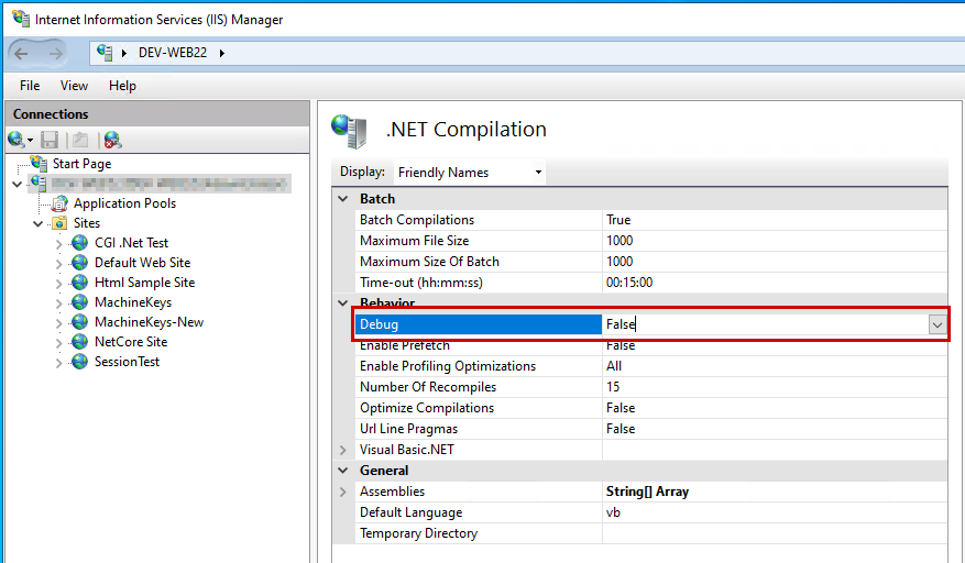 Legen Sie in der Liste der Parameterwerte, die im mittleren Bereich des IIS-Managers angezeigt werden, den Wert von Debug unter der Kategorie "Verhalten " auf Folgendes fest: