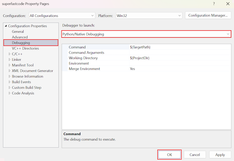 Wenn Sie das Debugging des nativen Codes aktivieren, wird das Python-Ausgabefenster möglicherweise sofort geschlossen, nachdem das Programm beendet wurde, ohne anzuhalten und den Hinweis Press any key to continue anzuzeigen. Um die Pause und Eingabeaufforderung zu erzwingen, nachdem Sie das native Code-Debugging aktiviert haben, fügen Sie das