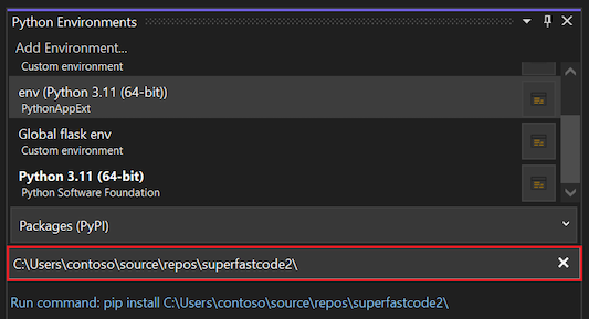 pipBefehl in der Python-Umgebung ausführen, die für Ihr Python-Projekt aktiviert ist. Wenn Sie die aktive Python-Umgebung für Ihr Projekt im Projektmappen-Explorer erweitern, sollte ein Eintrag für das C++-Projekt angezeigt werden, z. B. Superfastcode.