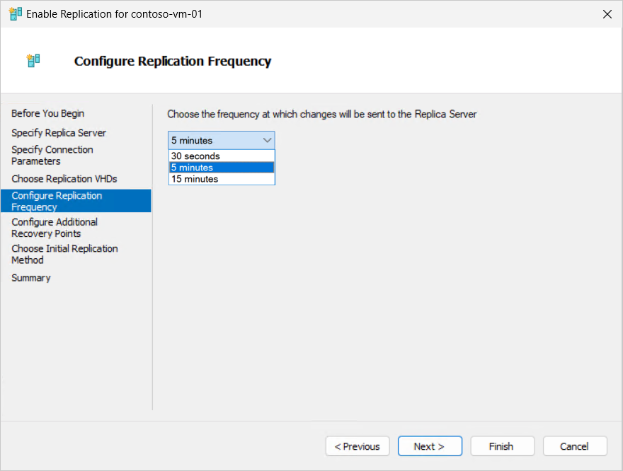 Geben Sie zum Konfigurieren der Replikationshäufigkeit an, wie oft Änderungen von den primären Clustern oder Hosts an die Replikate synchronisiert werden sollen: 30 Sekunden, 5 Minuten oder 15 Minuten. Wählen Sie dann Weiter aus.