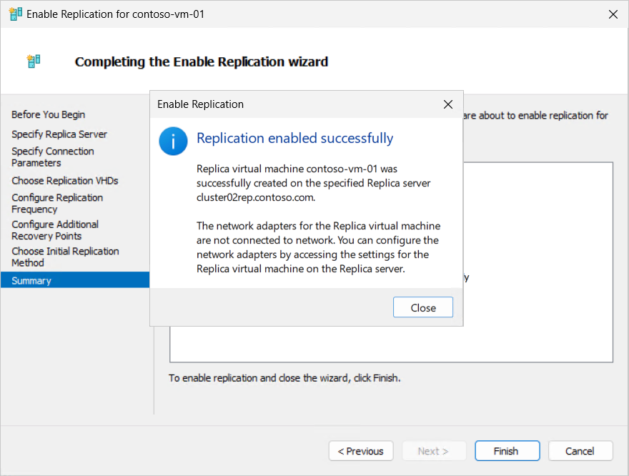 Überprüfen Sie die Zusammenfassungsinformationen, und wählen Sie dann "Fertig stellen" aus. Das daraufhin angezeigte Dialogfeld zeigt an, dass die Replikation erfolgreich aktiviert wurde.