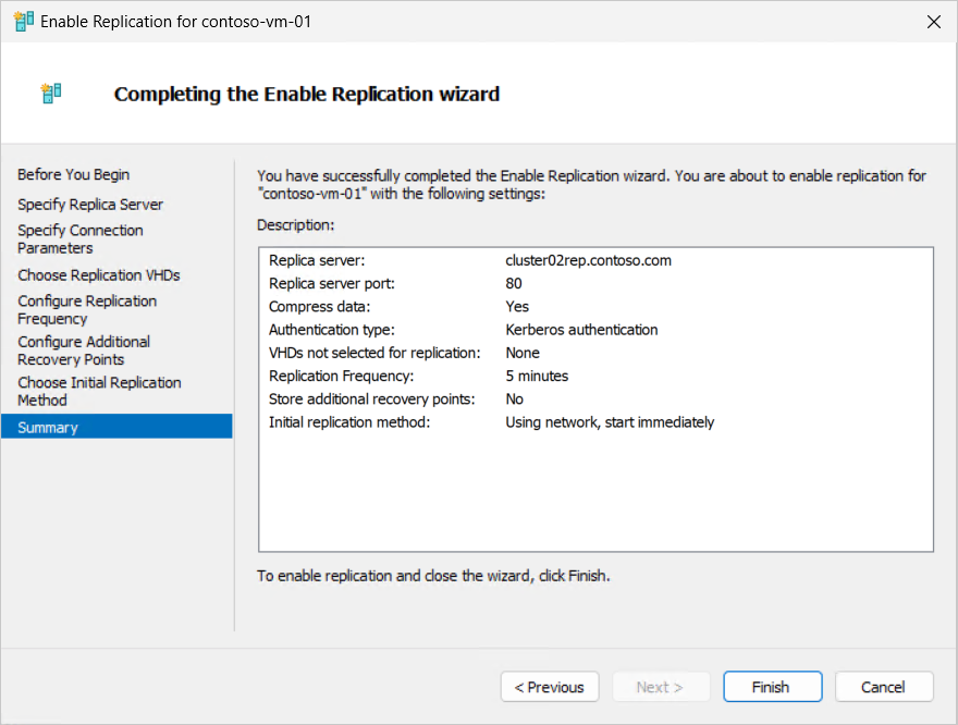 contoso-vm-01 Replicating Normal Replica 300 hyperv01 cluster02rep 80 Kerberos Simple