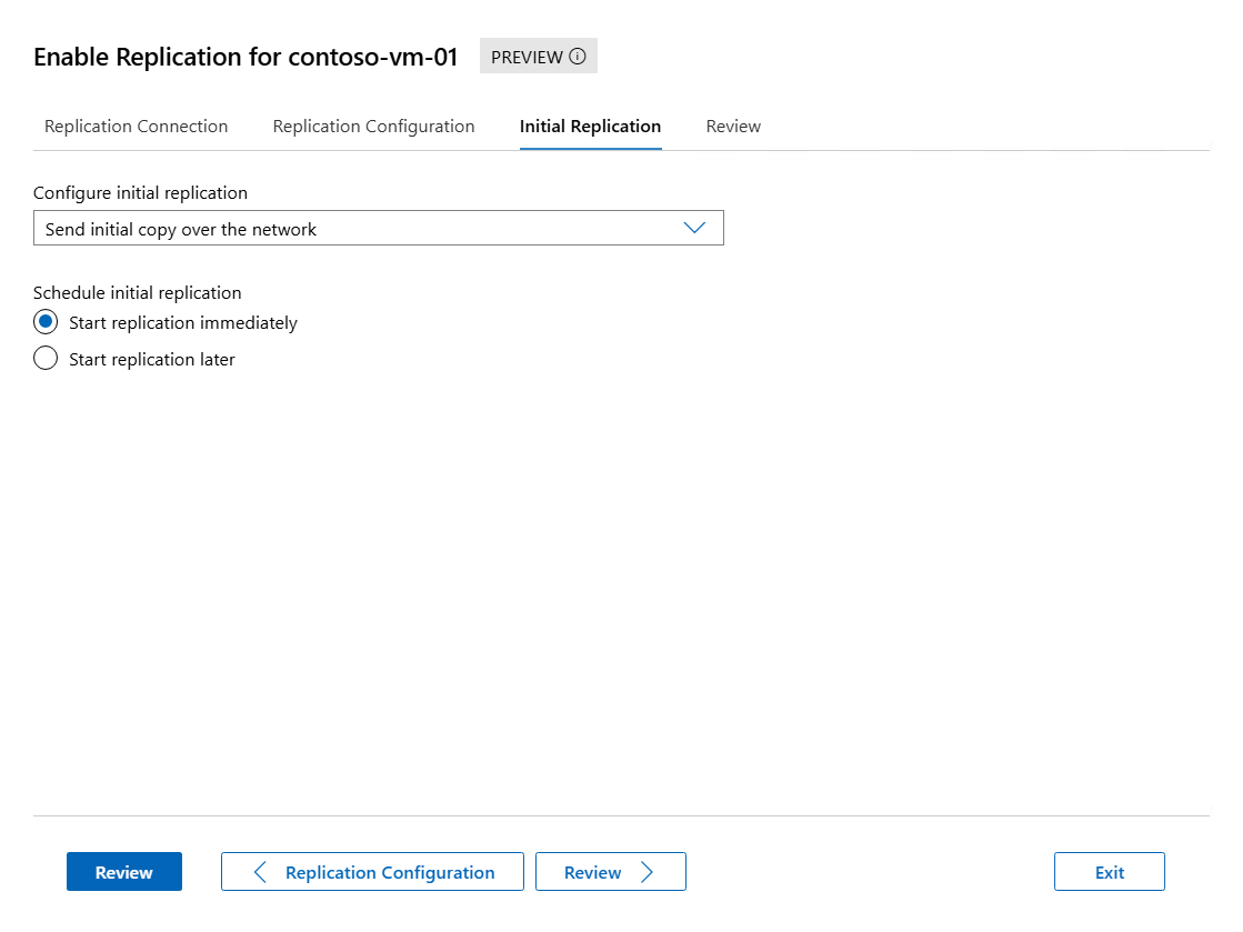 Füllen Sie für die Registerkarte " Erste Replikation " die folgenden Informationen aus, und wählen Sie dann "Überprüfen" aus, um fortzufahren: