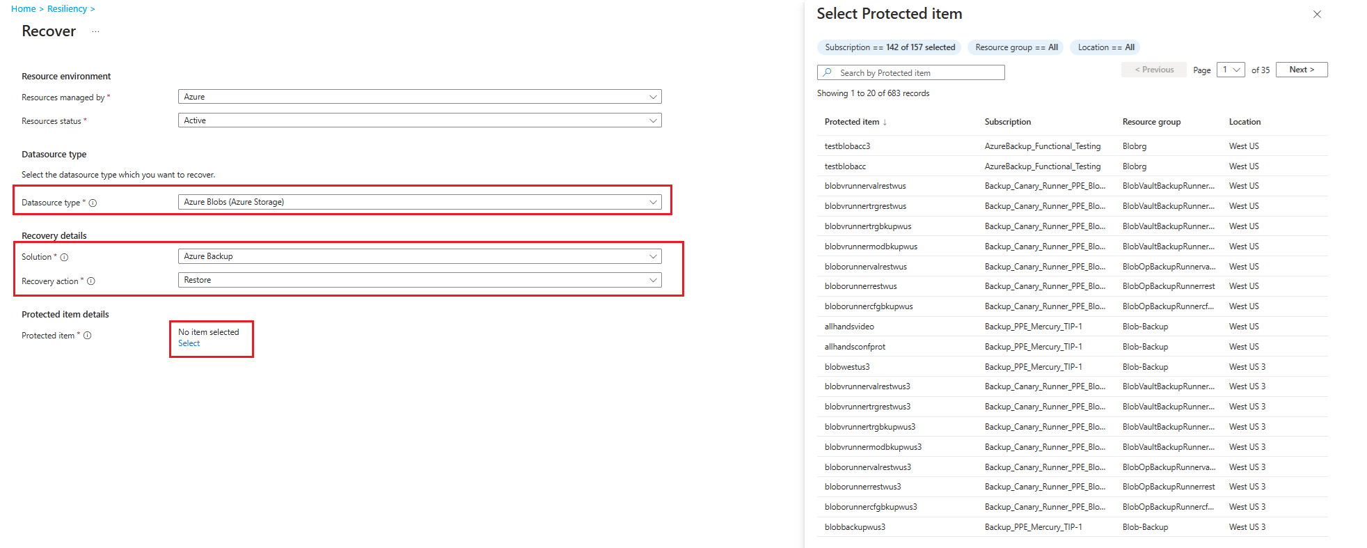 On the Recover pane, under Resources managed by, select Azure Blobs (Azure Storage) as the Datasource type, which you want to recover, and then select Backup as a solution through which you want to recover the item. Click Select to select the item on which you want to perform the recovery action.
