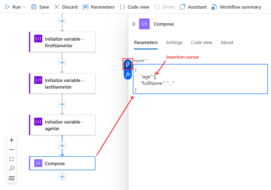 { "age": , "fullName": " , " }In the JSON object, put your cursor in the corresponding locations, select the dynamic content list (lightning icon), and then select the corresponding variable from the list: