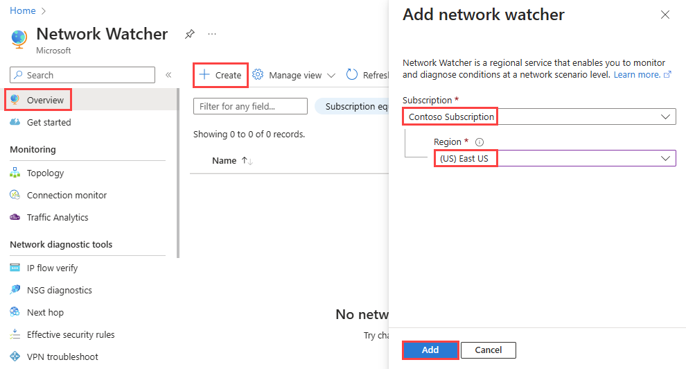 Screenshot shows how to create a Network Watcher in the Azure portal.