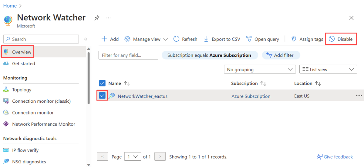2. On the Overview page, select the Network Watcher instances that you want to delete, then select Disable.